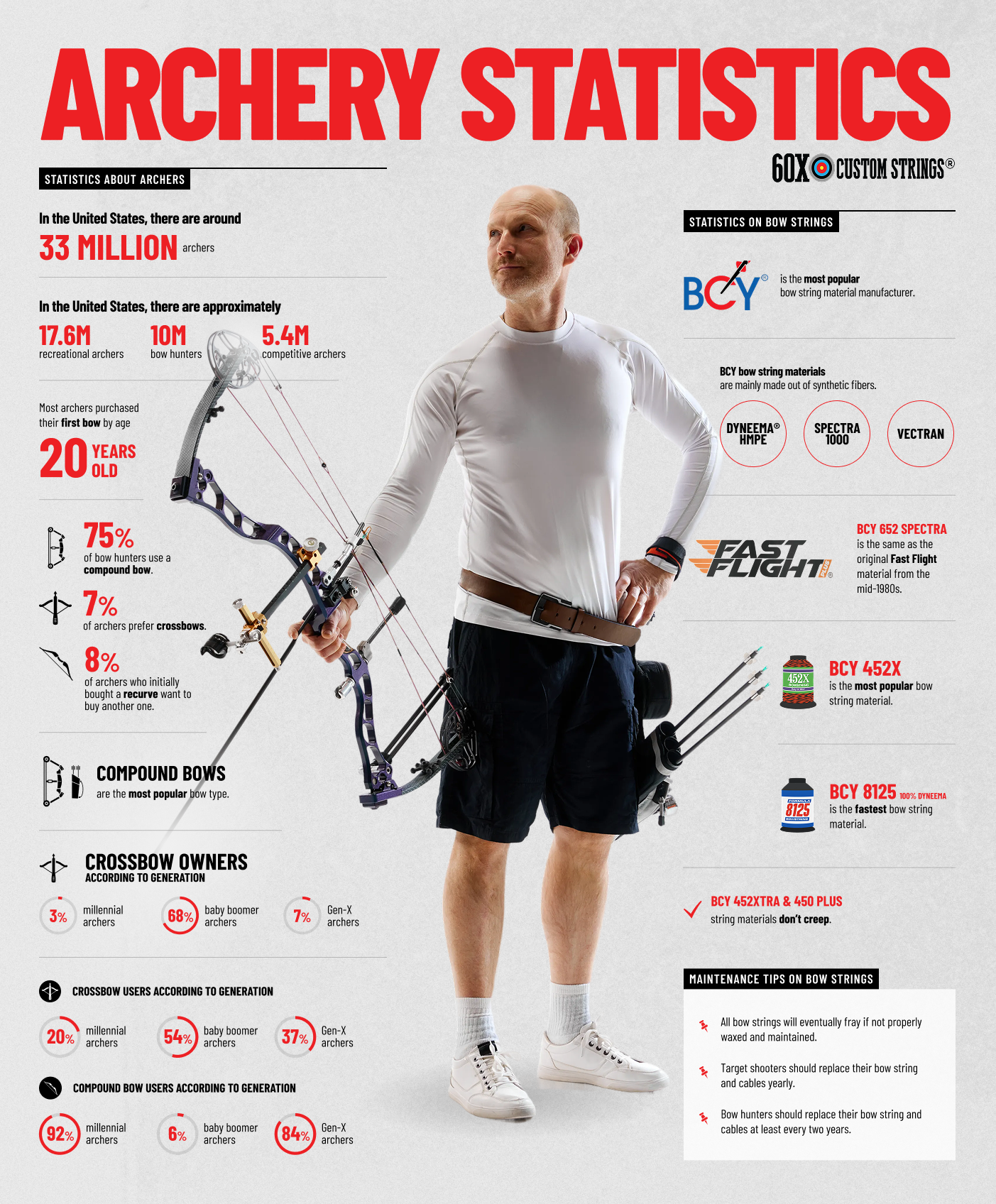 Next, we’re going to provide facts about the different types of bow string material options out there. These archery statistics and facts will reveal insight into the industry you may not have known about.
